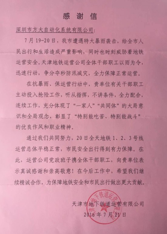 近日,天津地鐵運營公司向方大自動化系統(tǒng)有限公司發(fā)來感謝信,高度評價自動化公司在天津地鐵“抗暴雨、保運營”行動中的優(yōu)良表現。感謝信說,