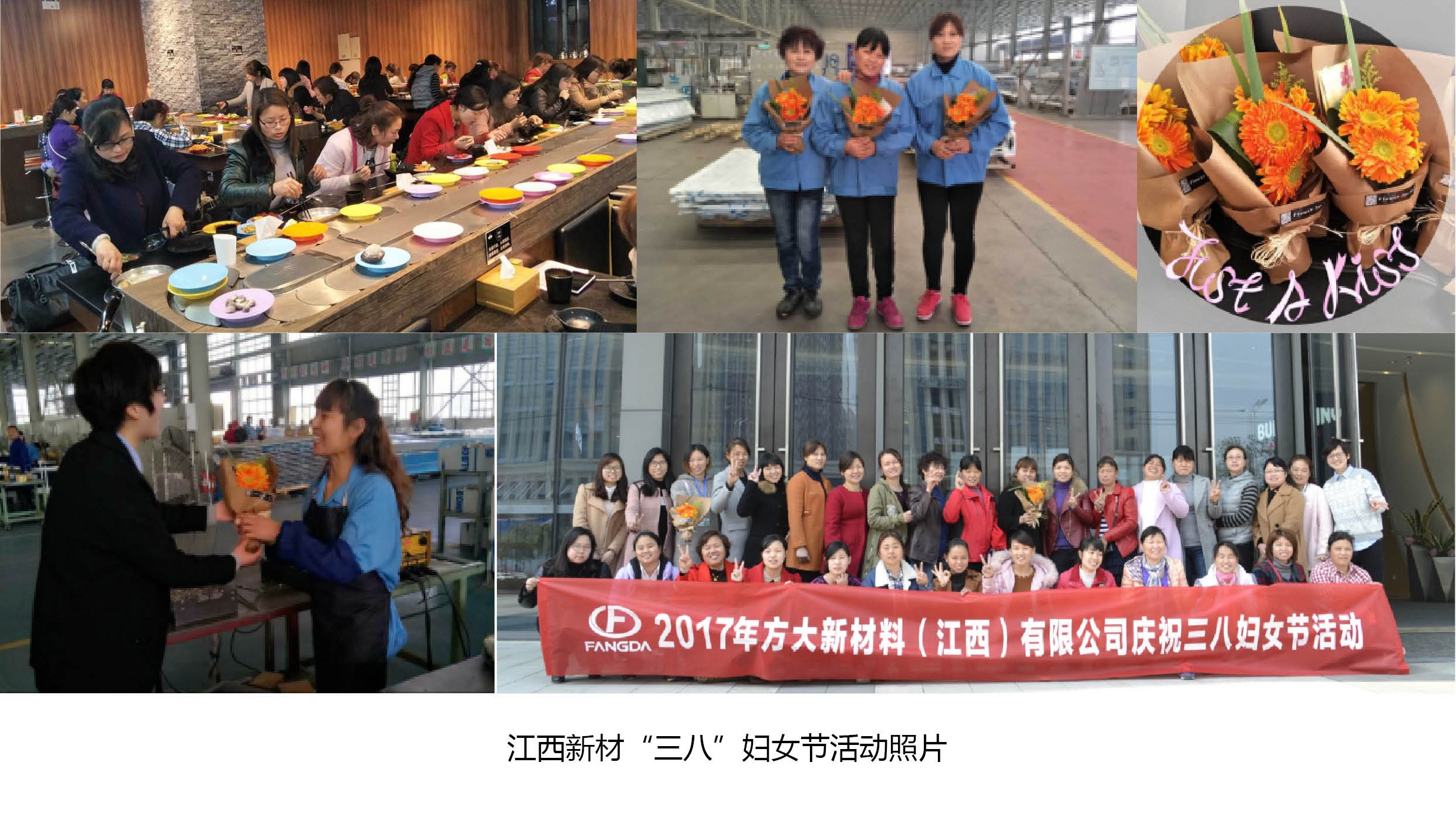 在南昌,江西新材組織了以“愛自己、愛生活”為主題的婦女節(jié)系列活動,共54名女員工參與其中。活動內(nèi)容包括:向女同事送花、合影留念、自助火鍋用餐等。3月8日上午,江西新材行政人事部經(jīng)理吳宇華帶領(lǐng)送花小分隊,向正在崗位上工作的各位女同事遞上一束艷麗的花,表達公司對女員工節(jié)日問候。中午時間,全體女員工在廣場合影留念,隨后前往一回旋自助火鍋店聚餐。江西新材以平凡簡單的方式,贏得了女員工們滿滿的感動。女員工們紛紛表示,今年的“三八”婦女節(jié)系列活動有驚喜、有創(chuàng)新、更有感動。