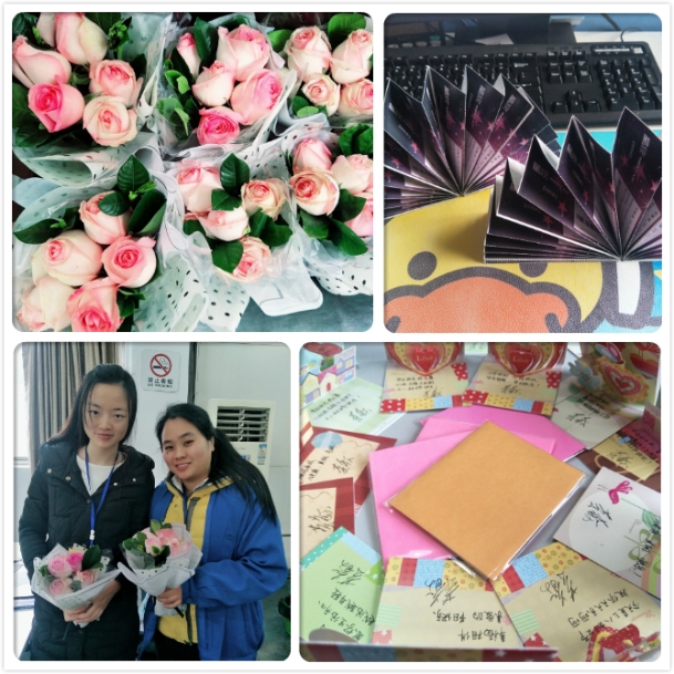 在南昌,為肯定和感謝全體女員工們一直以來的辛勞工作和默默奉獻,江西新材準備了神秘驚喜:有浪漫的電影票、美麗芬芳的花束,還有總經理黃敬一一簽名的祝福賀卡,為全體女員工送上節日的問候。