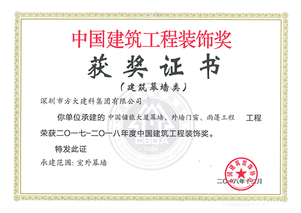 中國建筑工程裝飾獎是由中國建筑裝飾協會主辦的評選活動,自2001年起每年進行評選,是建設部批準設立的中國建筑裝飾行業的最高榮譽獎。方大建科承建的四項幕墻工程獲此獎項,是對公司精湛的幕墻設計能力和先進的施工工藝的充分肯定。