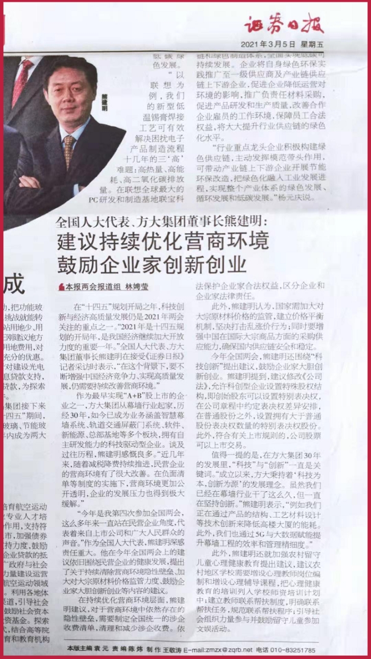 3月5日,證券日報刊發方大集團董事長熊建明兩會專訪報道《全國人大代表、方大集團董事長熊建明:建議持續優化營商環境 鼓勵企業家創新創業》